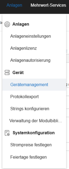 1. Gehe im Menü auf Anlage -> Gerätemanagement